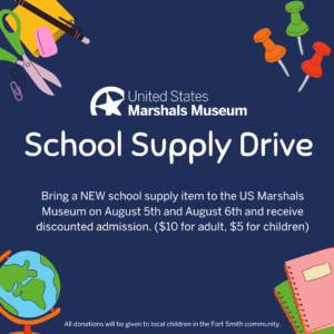 Donate school supplies on August 5th or 6th, 2023 and get in the U.S. Marshals Museum at a discounted rate. This rate will be $10 for adults and $5 for children.